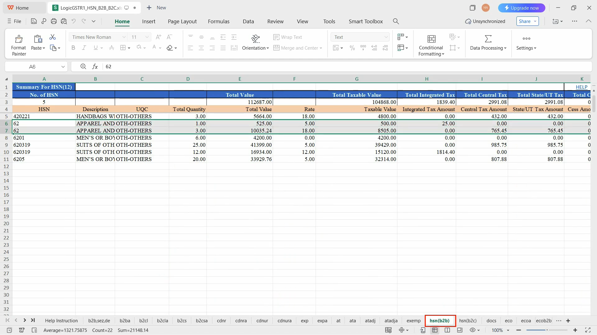 * Locate the **incorrect HSN codes** mentioned in the warning (e.g., in rows 6 and 7).