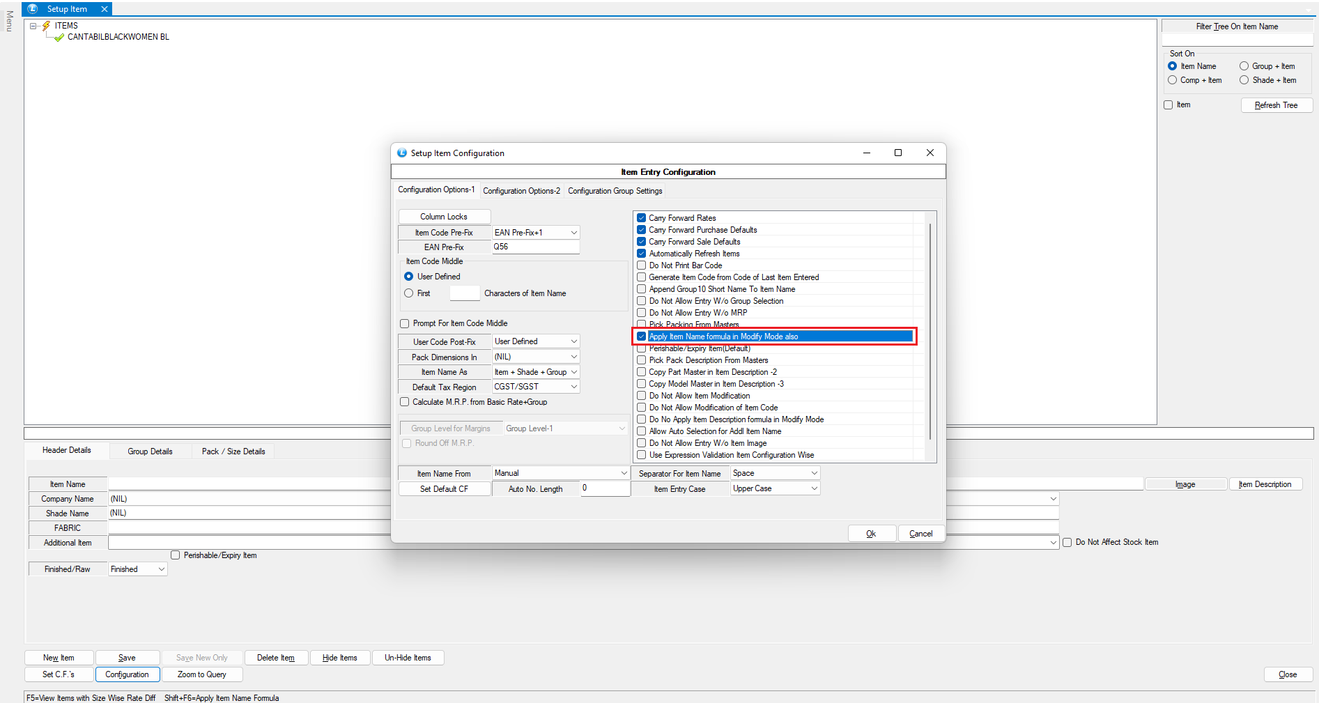 * Locate the option and enable "Apply Item Name formula in Modify Mode also" under the Configuration option-1 tab.