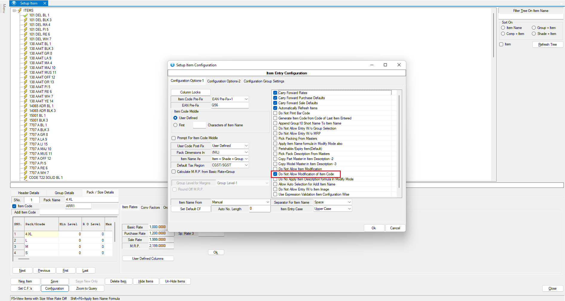 * Locate the option "Do Not Allow Modification of Item Code" under the Configuration option - 1.