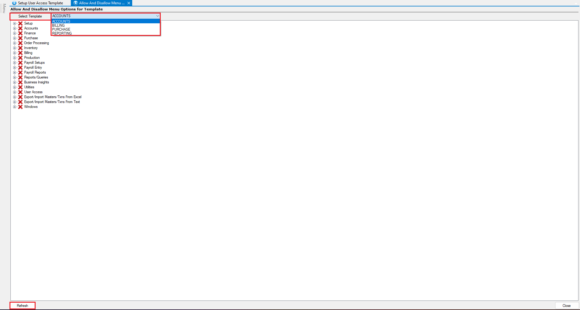 * Navigate to **Allow/Disallow Menu Options to Template**