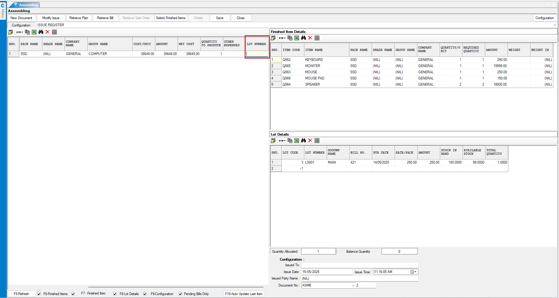When you select Manual, the software gives you the option to enter the LOT number manually in the Assembling window.