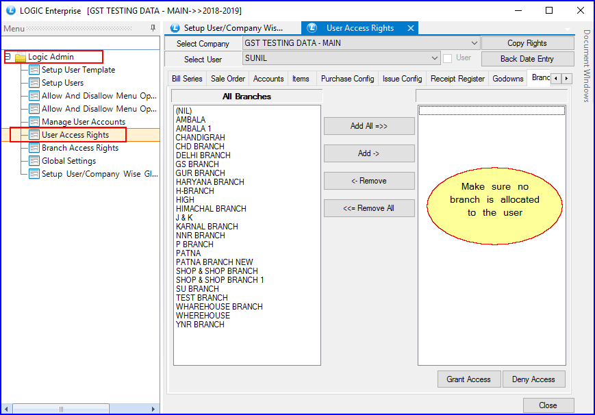 Make sure that no branch is assigned to the user in the **User Access Rights** window.
