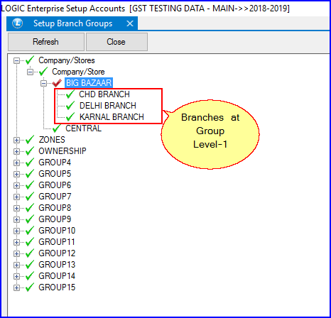 The following picture shows that the user is generating the report and is selecting the branch. When doing so, all the branches under Group Level-1 will also appear in the search window as shown in the picture below: