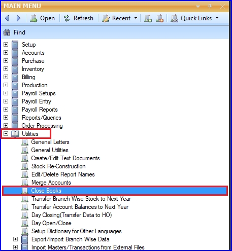 Step-2 Go to Utilities from Main menu & click on Close Books option.