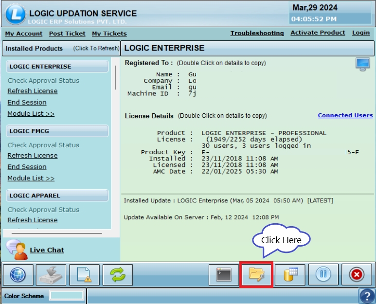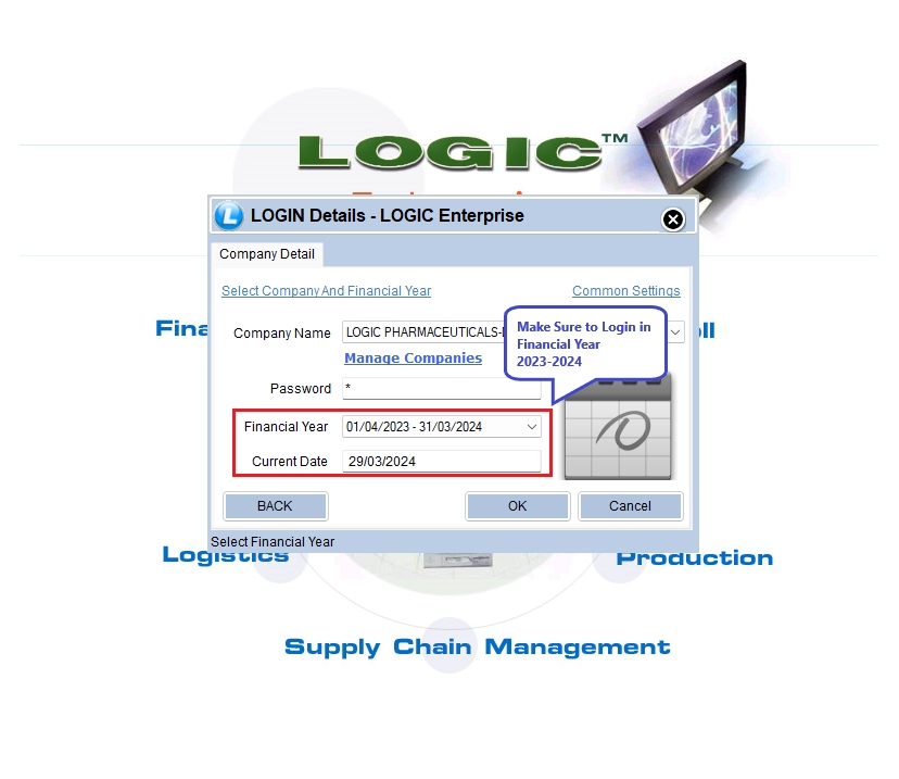 This option will work only for a customer using Logic ERP application other than Logic Enterprise When you login in the software on or after 1st April and you haven’t performed close books, then close books window will automatically open prompting you to perform close books before using the software. You can also click on cancel to continue work in the previous year and later perform close books.