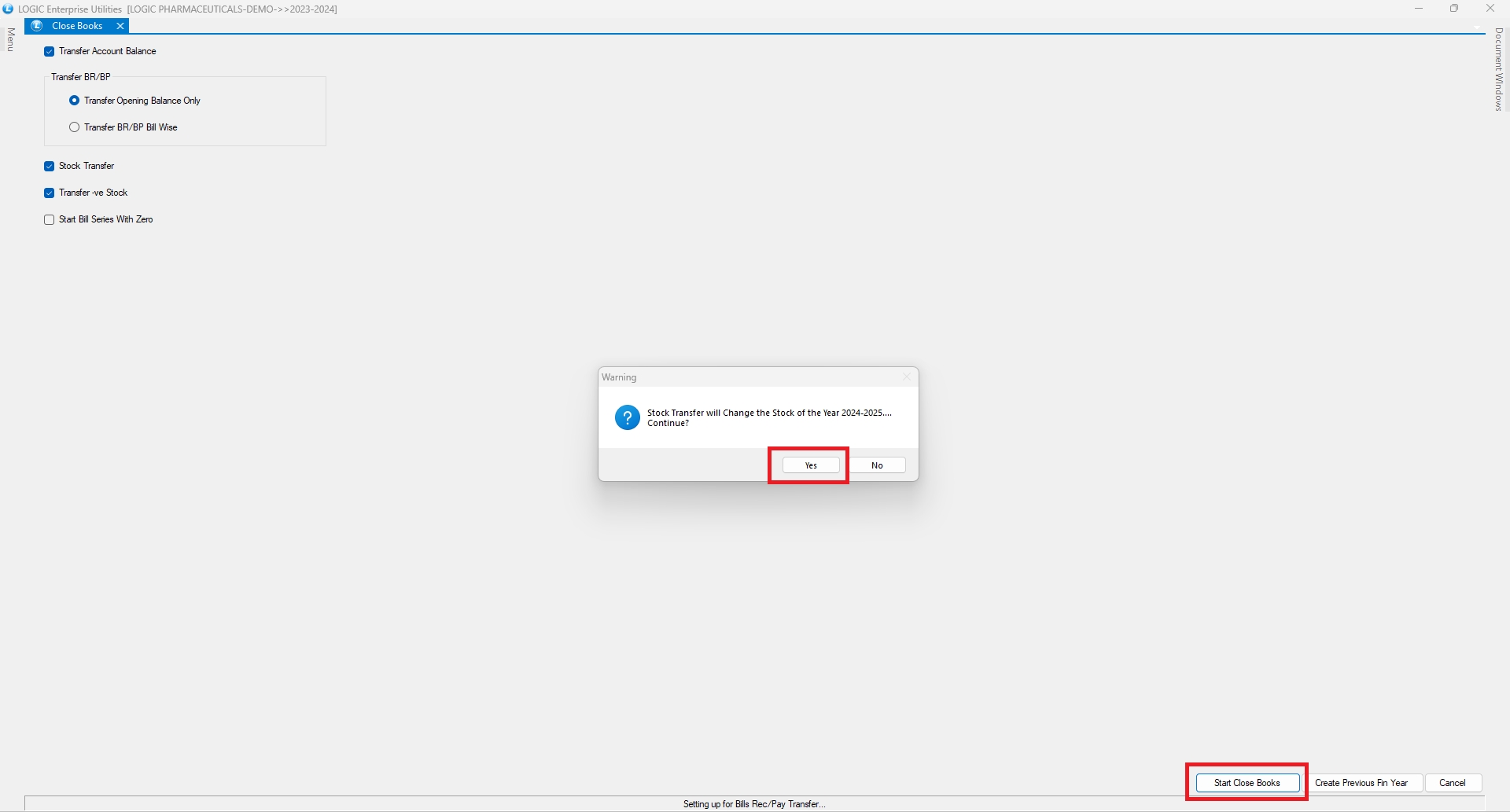 Step-3 Changes that will occur in the Stock of 2023-2024 will also affect the Stock of the Year 2024-2025. Click on Yes button to begin Close Books process.