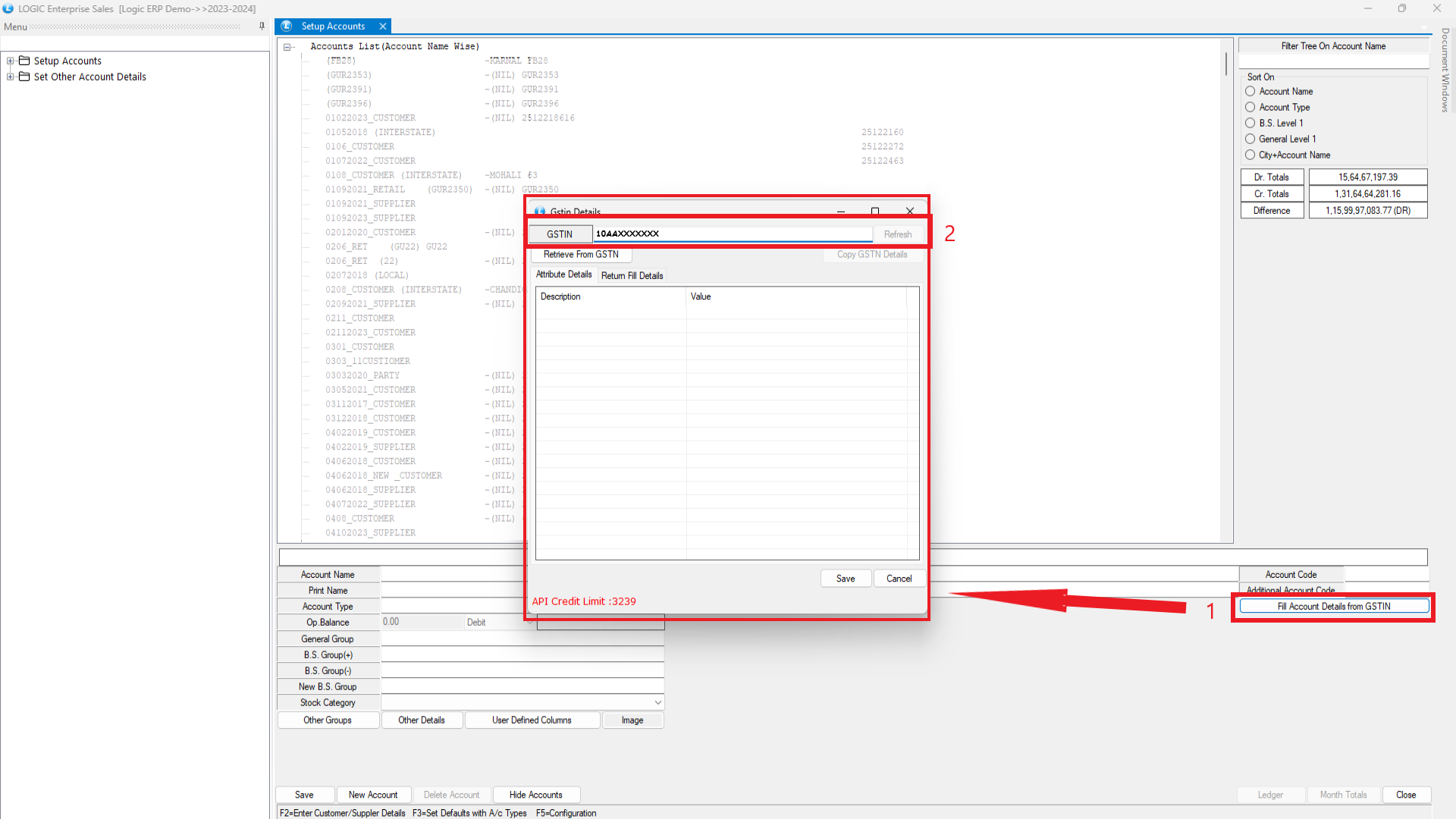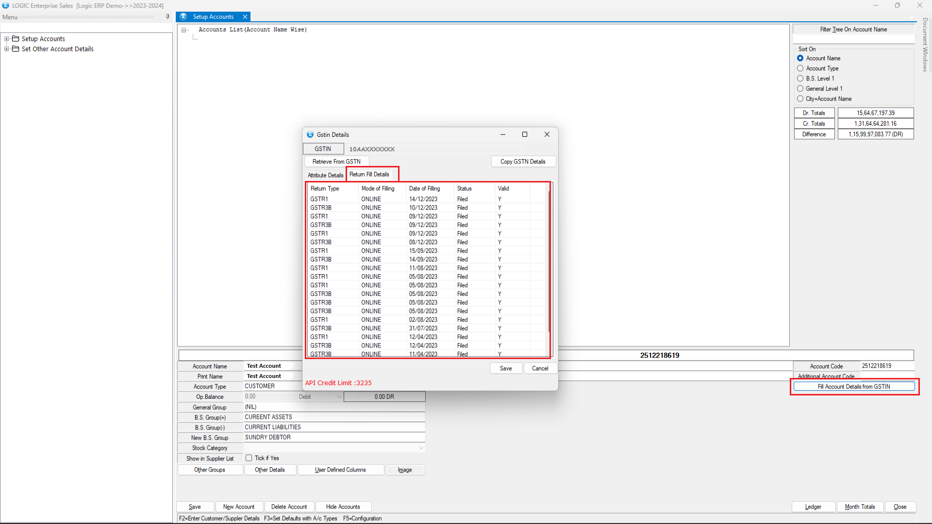 One more option is added inside the “Fill Account Detail From GSTIN” that is Return fill Details. We can fetch the return filed detail of that account also by using this.