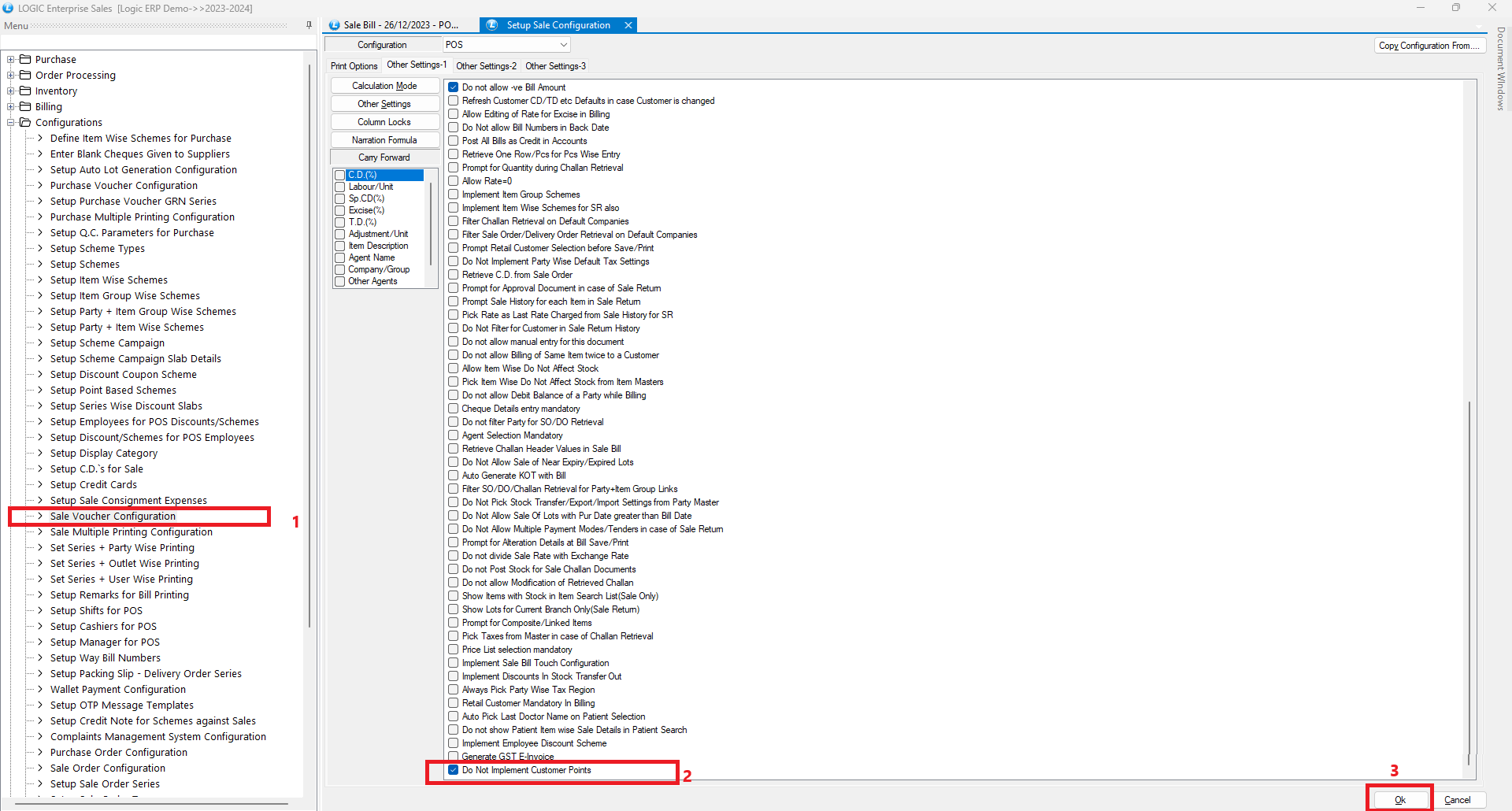 Step 1: Go to to the Sale Voucher Configuration > Other setting 1 > tick “DO not Implement Customer Point”