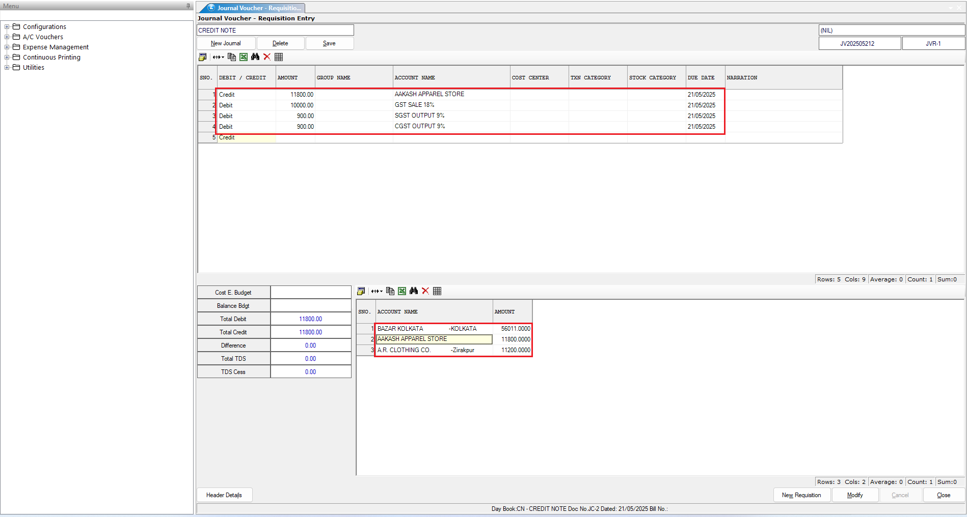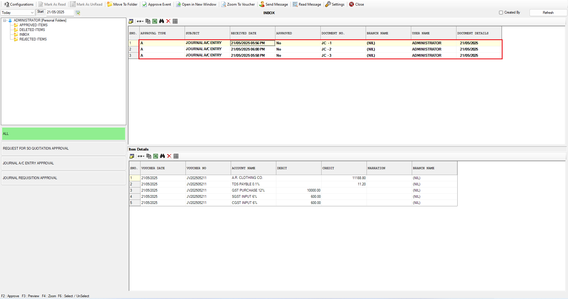 Step 5: The following image shows the approval window, where you can find the list of JV entries pending approval. Once the entries are approved, they will be automatically posted to the respective ledgers.