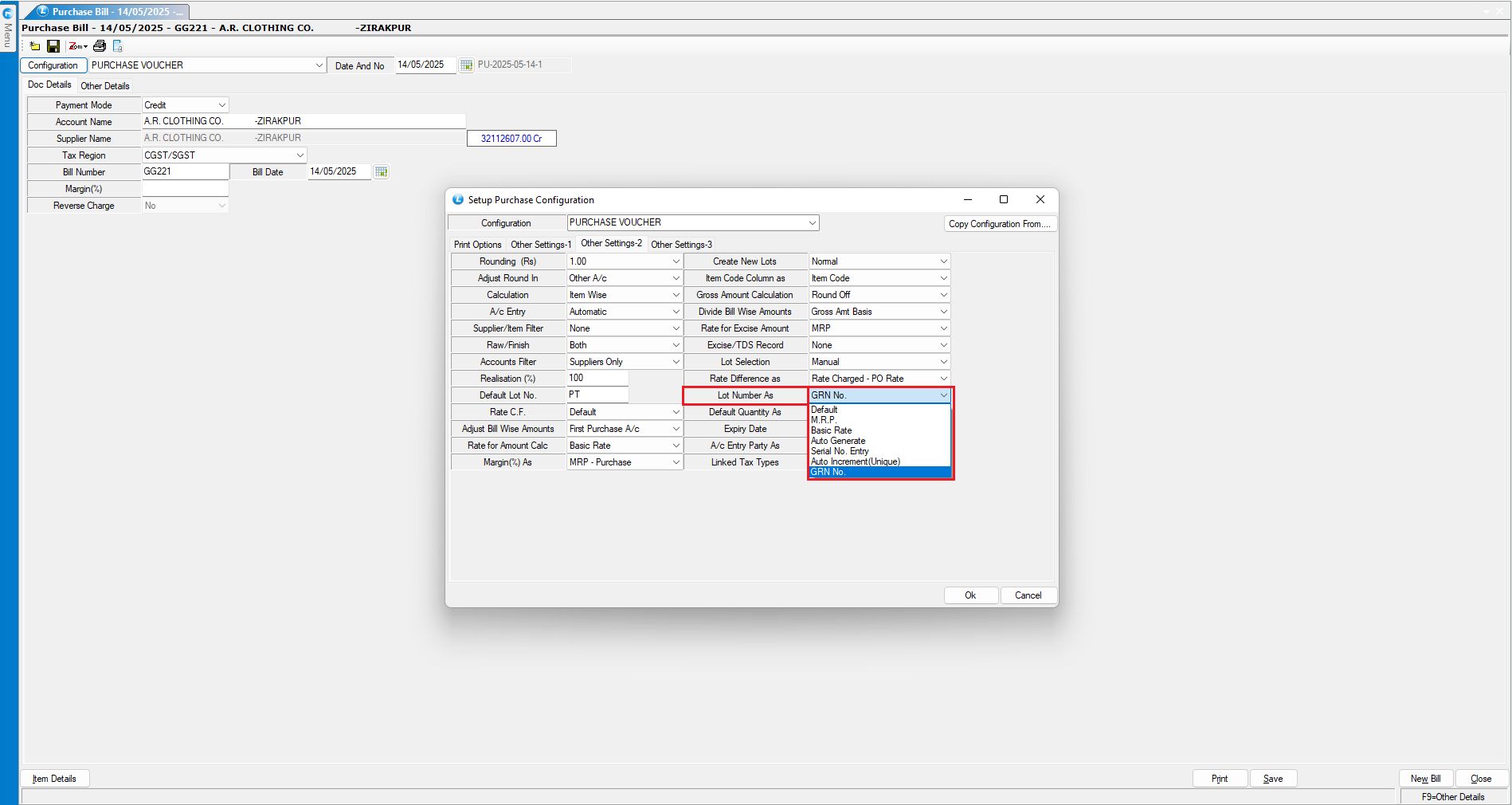 Step 1: Navigate to the Purchase Voucher Configuration in Logic ERP Click on Other Settings- 1 and then Locate the option Labeled: LOT Number As: Select {GRN No.}