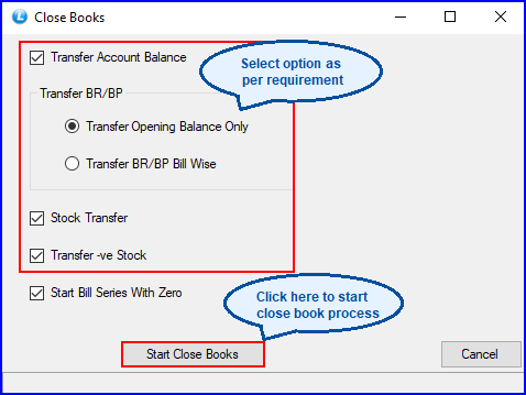 Step-3 Close Books window will open. You will notice the following options: **Please read following options carefully.