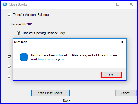 After the close books process finishes, click on the Ok button. Now you can Login in the new Financial year 2024-2025 created.
