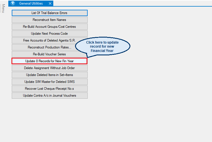 Step-1 Login into the software in the new financial year. Step-2 Now, Go to ‘Utilities>General Utilities’ window. Step-3 Click on ‘Update 0 Records in New Fin Year‘ button and wait for the process to finish.