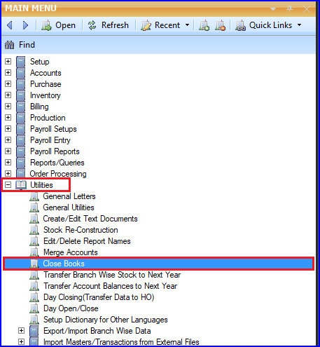 Step-2 Go to Utilities from Main menu & click on Close Books option.