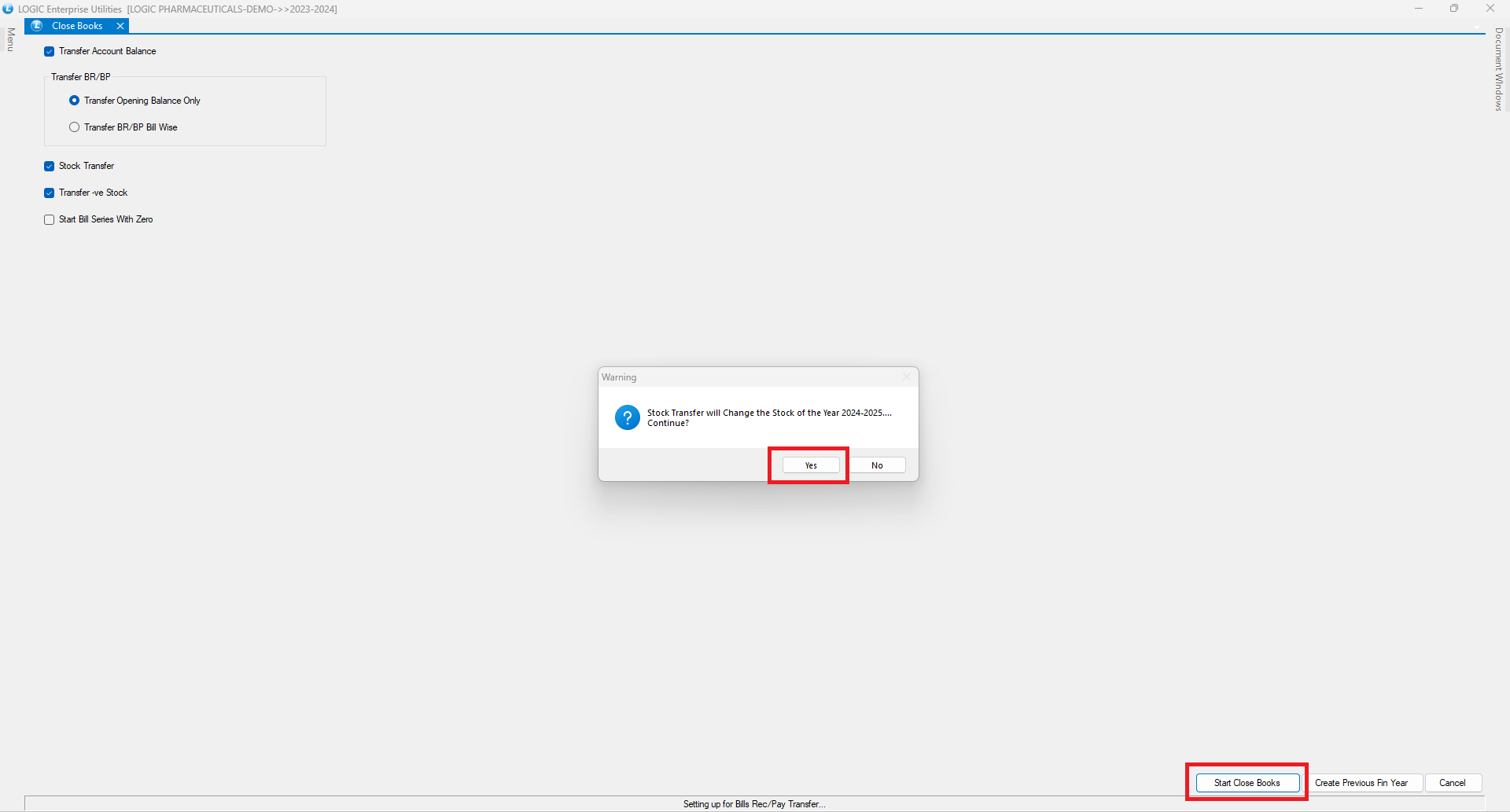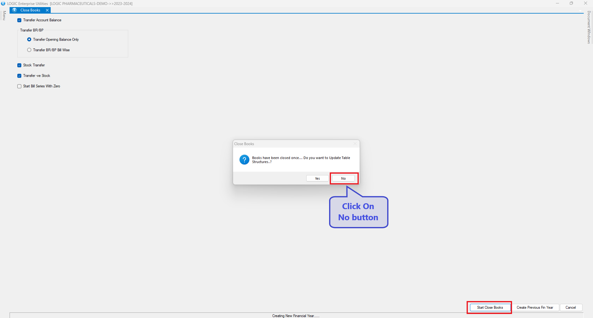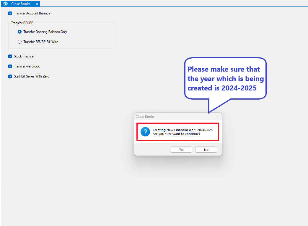 Step-3 Click on Start Close Books button. A ‘Warning Message Box’ will appear. Make sure to carefully check the New Financial Year details. It should be 2024-2025.After that, click on the Yes button. Close Books processing will start.