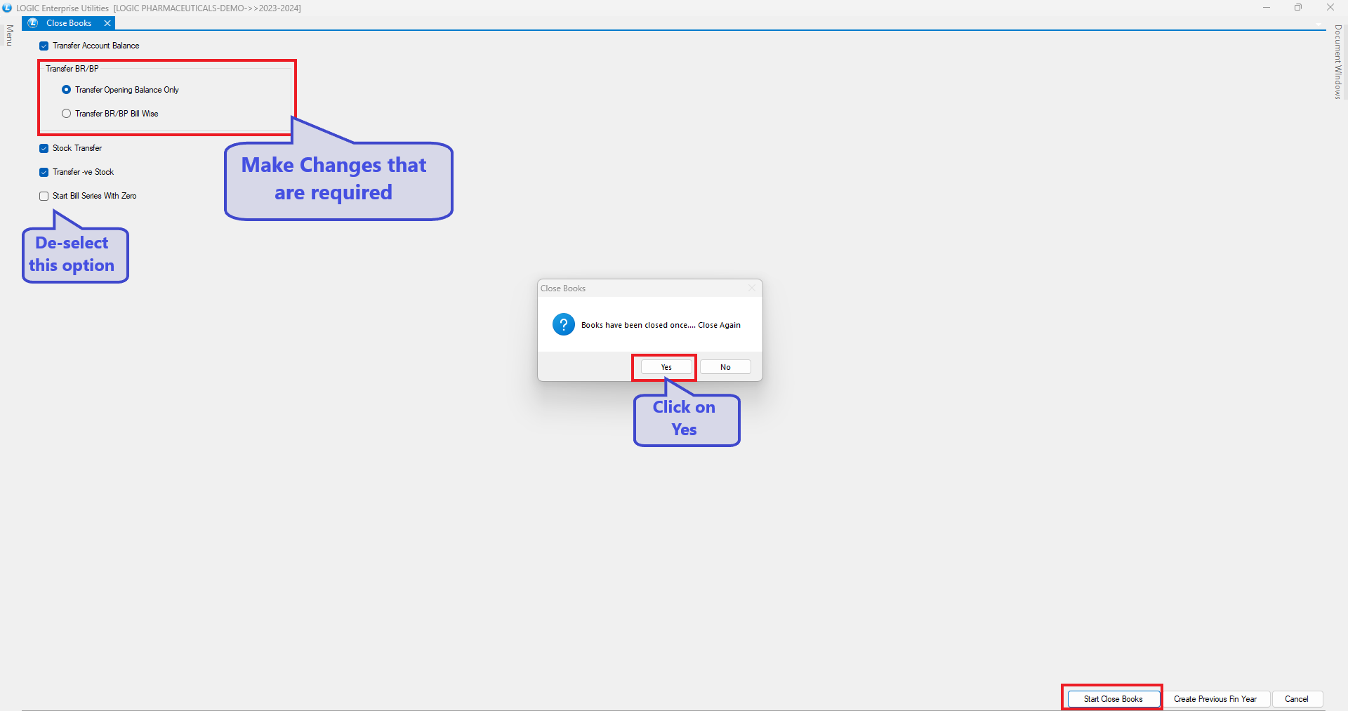 Step-1 Log in with your admin account in the financial year 2023-2024. Then open Close Books. Select the options in which you need the changes and make sure to un-check the “Start Bill Series with Zero” option. Then click on Yes button to close books again.
