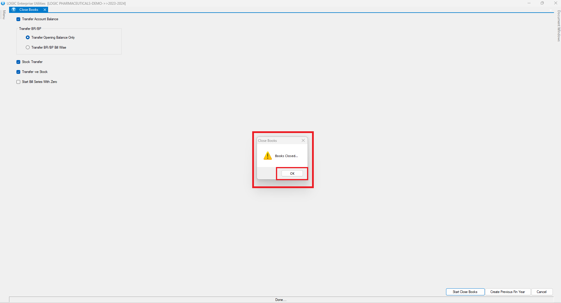 In case you do any changes in previous years data after you performed close books, then you have to perform the Close Books procedure again. Make sure you choose the correct financial year i.e., 2023-2024,( which is your previous financial year)
